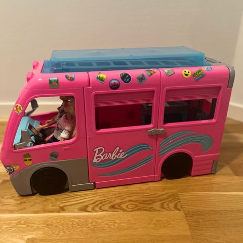 Barbie Autocamper sælges. Den er brugt, men fremstår flot. Den lave pris skyldes, at klap-sammen funktionen driller af og til.