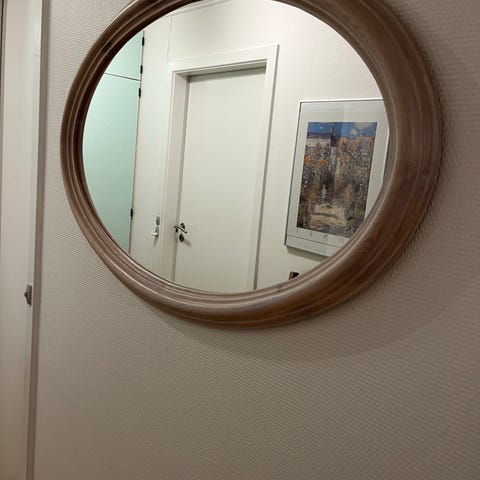Ovalt spejl i lyst træ, 95 cm lang og 60 cm høj. Sælges grundet flytning fra ikke rygerhjem og husdyr.