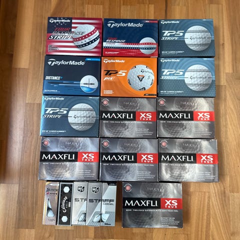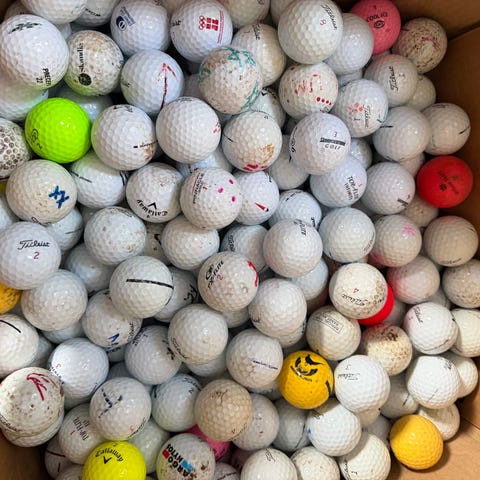 Golfbolde i forskellige mærker og farver, samlet i en rød beholder. Egnet til golfspil og træning.
