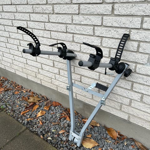 cykelholder til 2 cykler, til montering på bilens bagklap. Designet til at bære cykler sikkert under transport. Fremstillet med metal og polstrede arme for at beskytte cykler og bilens overflade. Passer til biler med bagklap, med justerbare stropper til fastgørelse.