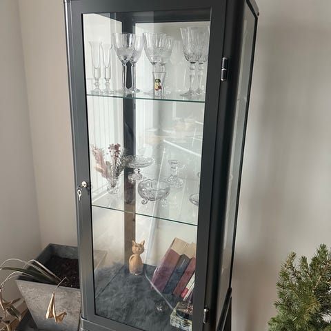 Væghængt vitrineskab med 2 glaslåger. I bøg med justerbar hylde. Flot stand. De udstillede genstande fælger naturligvis ikke med..
