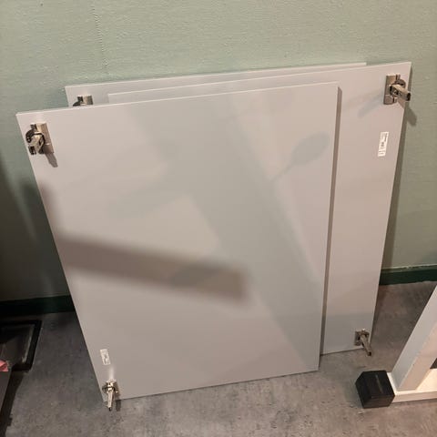 Vi har nedtaget alkoven og har ikke brug for skabene. Fronterne er 60x40 cm i serien Ekestad. Overskab er låger og underskabe er skuffer.