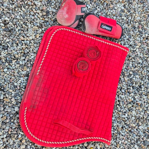 Rideudstyr bestående af sorte gamacher og en hvid underlagspude. Gamacherne har et logo i gult og sort. Underlagspuden er quiltet og viser tegn på brug.