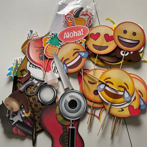 Fire ballonbuer, tre af dem med store champagneflasker (folieballoner) + et selfiesæt med stor sølvfarvet ramme (oppustelig) og div. sjove hatte/briller på pind + lyserød/hvid guirlande fra søstrene grene.