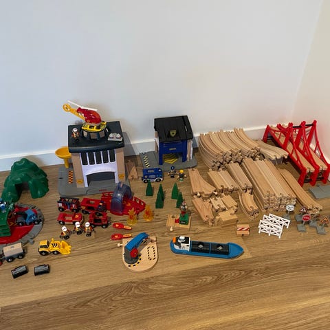 BRIO trælegetøj togsæt med forskellige træskinner, tog, broer, trafikskilte og dyrefigurer. Bondegården er med lyd, når man sætter dyrene i. Et af togene er elektrisk. Et tog kan sige en lyd.