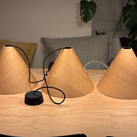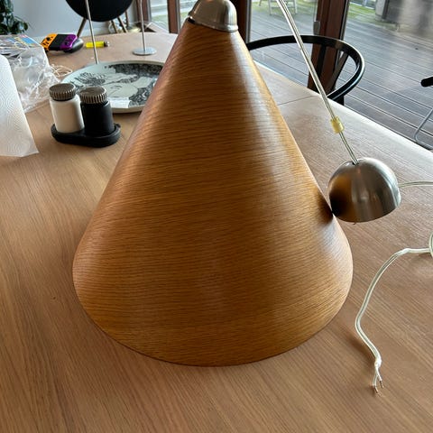 Lampen er kendt for sit unikke design, hvor skærmen er lavet af sammenføjet træfiner i en 30 graders vinkel.