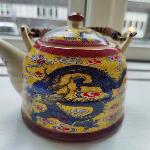 Kinesisk tekande/kaffekande med låg. Porcelæn. Højde med låg ca. 21 cm. Ingen skår eller revner. Har også skål der passer til - se anden annonce,