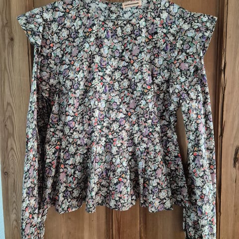 Blusen har et smukt blomstermønster i lyse farver, fine bindebånd foran og små flæsedetaljer langs udskæringen. Ærmerne er let puf med elastikafslutning, hvilket giver et romantisk og tidløst udtryk.