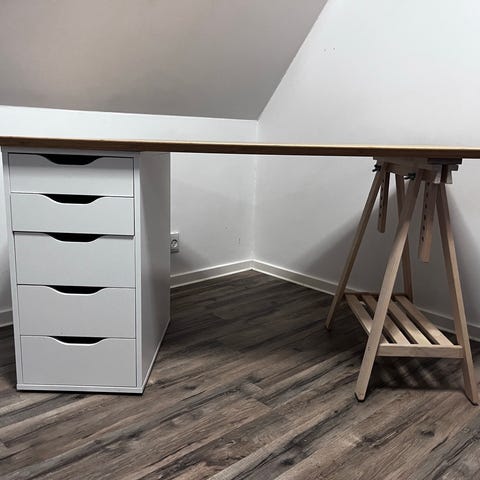 Stort skrivebord brugt i hjemmekontor/syværelse i helt fin stand med tre skuffer. Bordlampe kan medfølge.