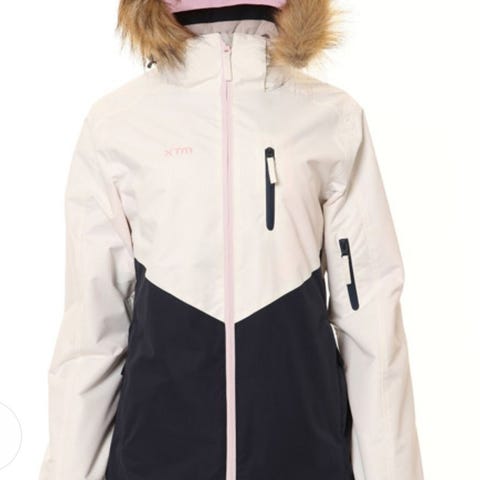Columbia Platinum dame skijakke i størrelse XS. Jakken er hvid med sort lynlåse og har en hætte med pelskant. Indvendigt foret med guldfarvet materiale. Designet til sport og udendørs aktiviteter. CWP skibukser som passer til. Jakke købt i 2025, kvittering haves.