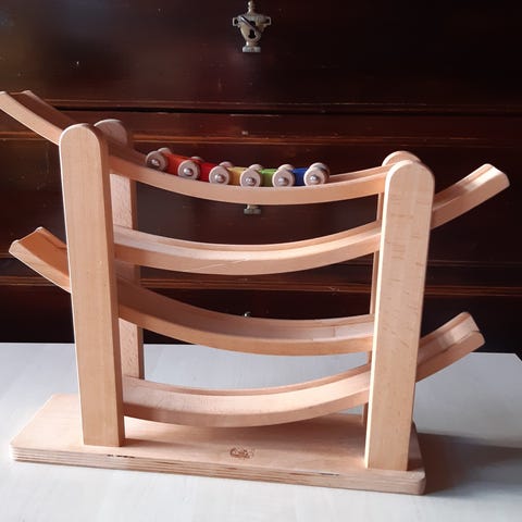 Fremstillet i plastik og træ. Designet til børn til leg og udvikling af motoriske færdigheder.