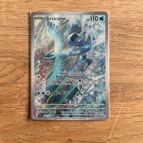 Pokémon Articuno samlekort med holografisk effekt. Kortet viser Articuno, en af de legendariske Pokémon, med detaljeret grafik og tekst, der beskriver dens angreb og egenskaber.