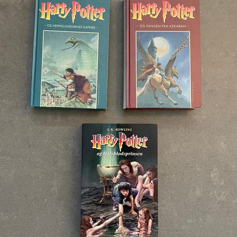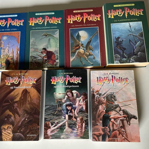 Harry Potter Bogserie bestående af 5 bind: Harry Potter og de Vises Sten, Harry Potter og Hemmelighedernes Kammer, Harry Potter og Fangen fra Azkaban, Harry Potter og Flammernes Pokal. Bøgerne er på dansk.