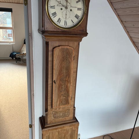 Gammelt standur udført i træ med pendulmekanisme. Uret har en urskive med tal og viser samt en dekorativ overdel med udskæringer og en figur på toppen. Standuret er udstyret med en dør, der åbner til pendulet og vægtmekanismen.