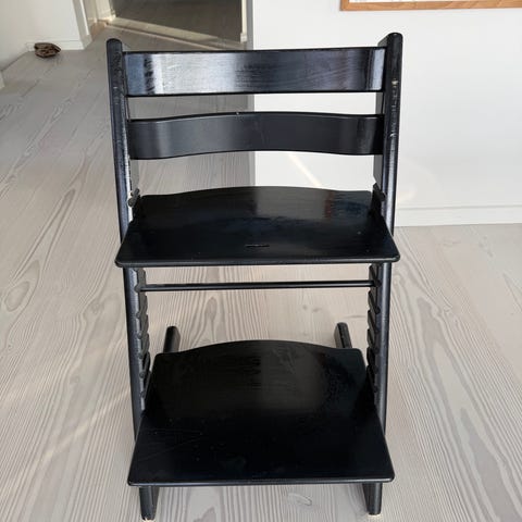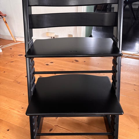 Stokke højstol i sort træ. Højstolen har justerbare trinplader og sæde, hvilket gør den egnet til børn i forskellige aldre. Designet til at give støtte og komfort under måltider eller andre aktiviteter.