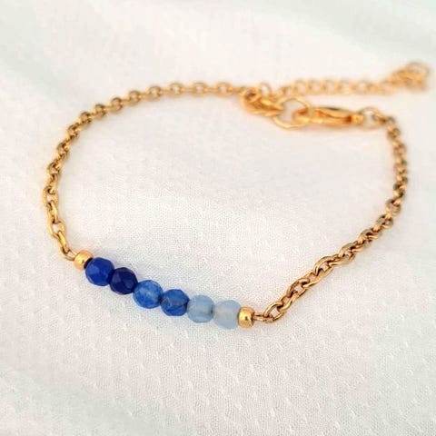 Flot armbånd med blåmelerede JADEPERLER og mellemled af tibetansk sølv. Armbåndet er i tre rækker og på memory wire, som tilpasser sig dit håndled. Armbåndet er 21 cm + 3 cm forlængerkæde. OPRYDNINGSPRIS