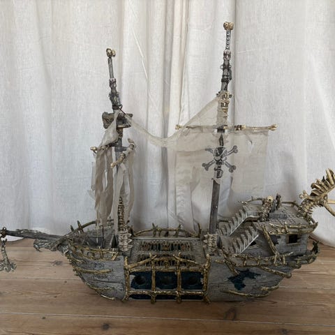 LEGO piratskib legetøj med flere små figurer og tilbehør. Skibet har detaljer som sejl, kanoner og gyldne udsmykninger. Sættet indeholder forskellige våben og redskaber til leg.
