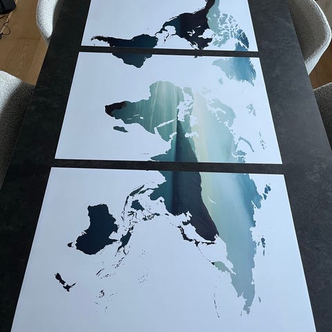 Dekorativt maleri med verdenskortmotiv i sort og sølvfarver. Maleriet har en tekstureret overflade og abstrakt udtryk, der kan anvendes som vægdekoration i forskellige rum.