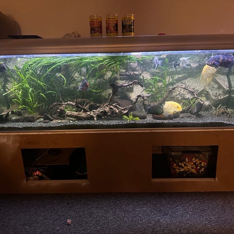 Velholdt akvarie. Står på hvidt skab. God kvalitet. Der medfølger Eheim spand filter, stor rod, lampe, baggrund mv