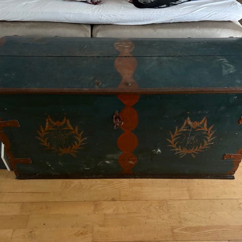 Antik trækiste med udskårne dekorative mønstre på fronten og siderne. Kisten har et hængslet låg og en rektangulær form. Fremstillet i træ med en naturlig, ældet finish. Velegnet til opbevaring af forskellige genstande.