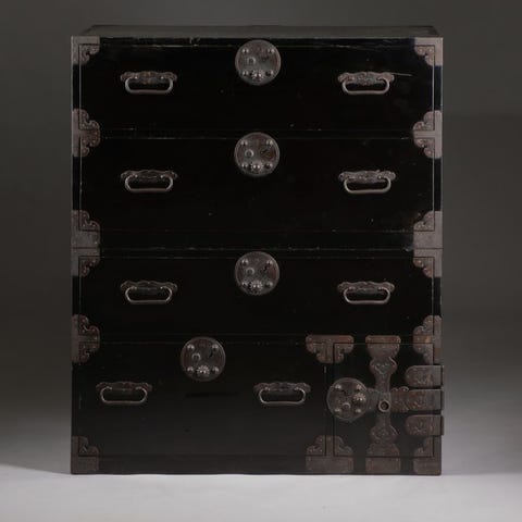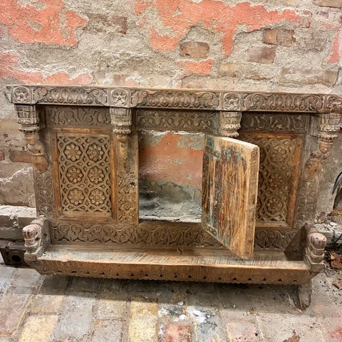 Antikt i disk træ front med dekorative udskæringer og skodder. Skabet har en rektangulær form og er fremstillet af træ med en naturlig, slidt overflade. Det består af to sektioner med låger, der kan åbnes. Velegnet til opbevaring og dekoration i hjemmet.