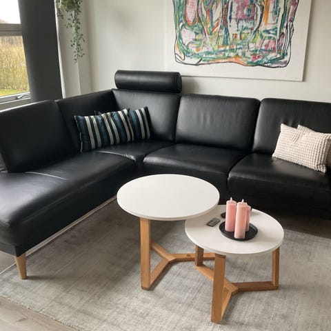 Sælger en stor og komfortabel hjørnesofa fra Hjort Knudsen, betrukket med sort semianilinlæder af høj kvalitet. Sofaen har et tidløst og elegant udtryk og passer godt ind i både moderne og klassiske hjem.