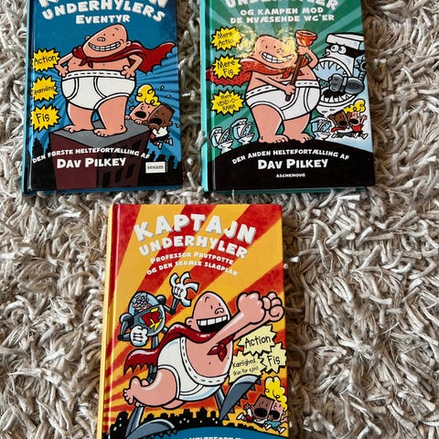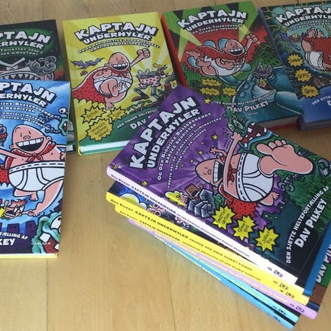 Dave Pilkey Kaptajn Underhyler børnebøger med flere titler inklusive 'Kaptajn Underhyler: Den første heltefortælling' og 'Kaptajn Underhyler: Kæmpeeventyret'. Line Kyed Knudsen Naja Münster børnebøger med titler som 'Naja Münster: En hemmelig fosset teltur' og 'Naja Münster: Den store fuglefest'. Bøgerne er illustrerede og rettet mod børn.