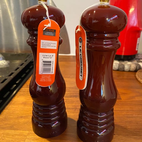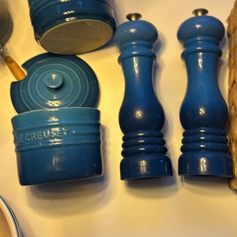Blandet Le Creuset køkkenudstyr bestående af opbevaringskrukke 2.3 ltr. og salt+peber-kværne i Volcanic, champagne-prop og en champagne-åbner.