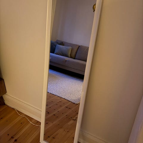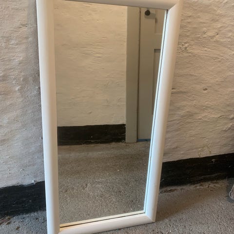 Spejl med hvid ramme til at hænge på væg. Højde 120 cm, bredde 60 cm
