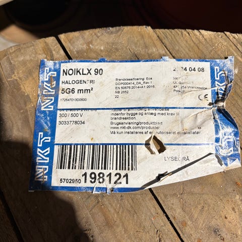 NKT Noxalx 90 kabel med 3 ledere af 6 mm² tværsnit. Kabeltypen er egnet til elektriske installationer og leveres på en spole.