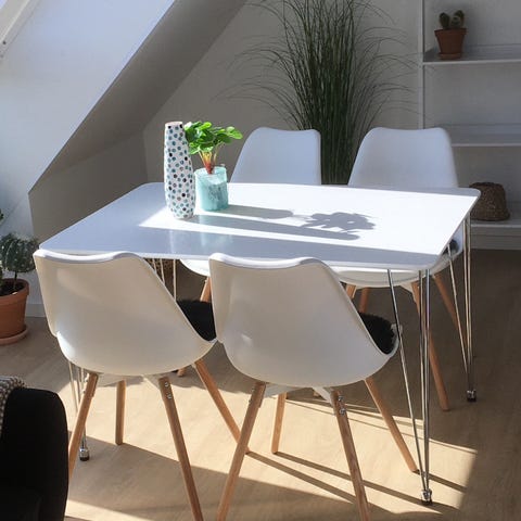 Spisebord 78 bred 100 lang samt 4 hvide stole .vel holdt og fra ikke ryger hjem sælges samlet for kun 400 kr