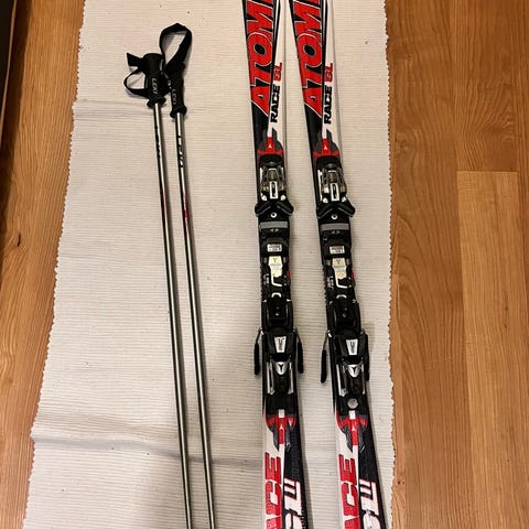 Atomic Redster X9 Race ski med en længde på 163 cm. Skiene er designet til racerløb og har en rød farve. De er udstyret med bindinger, der passer til de røde skistøvler jeg også sælger.