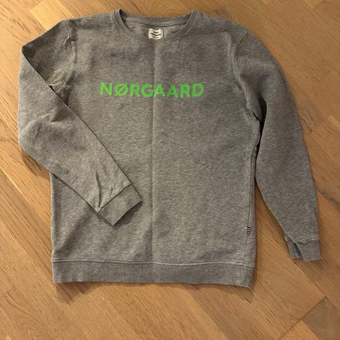 Grå trøje fra Mads Nørgaard. Der står str.14 i den, men jeg synes mere den er 158.