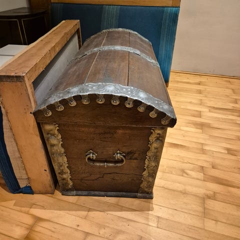 Hvidmalet gammel kiste med rum i rå træ, fin stand. Måler 120x60x60. Afhentes i Tranbjerg