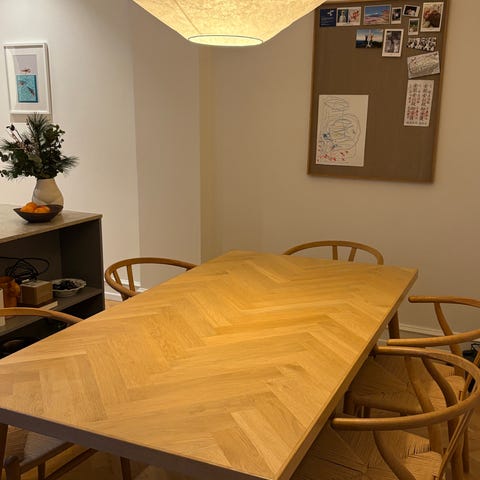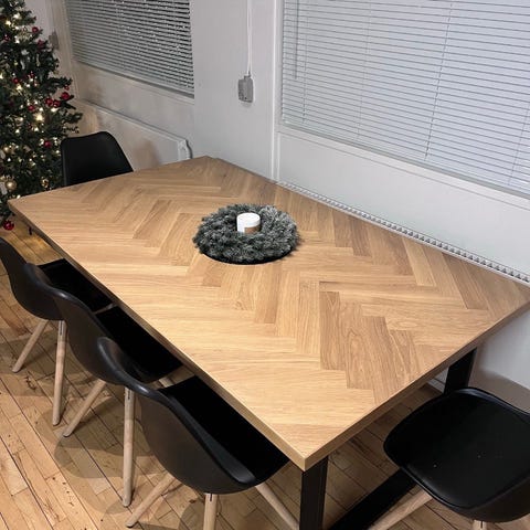 Jeg sælger dette Richmond sildebensbord i olieret eg fra ILVA. Det har været behandlet rigtig godt, og har fået olie hver 6. måned, og senest mellem jul og nytår, for at holde det pænt. Der er en meget utydelig ring på bordet, som kan fjernes ved en slibning, som man selv kan gøre med sandpapir.