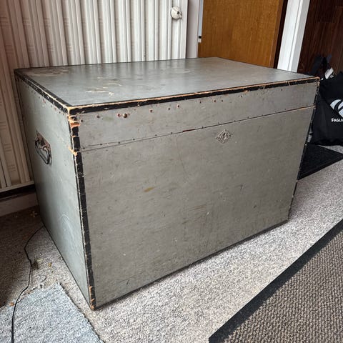 Kisten fremstår solid og stabil. Overfladen har naturlige brugsspor, ujævnheder og farveforskelle – præcis det, man ønsker ved et originalt gammelt møbel.