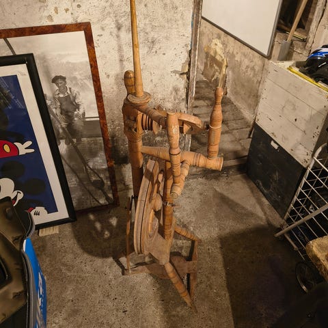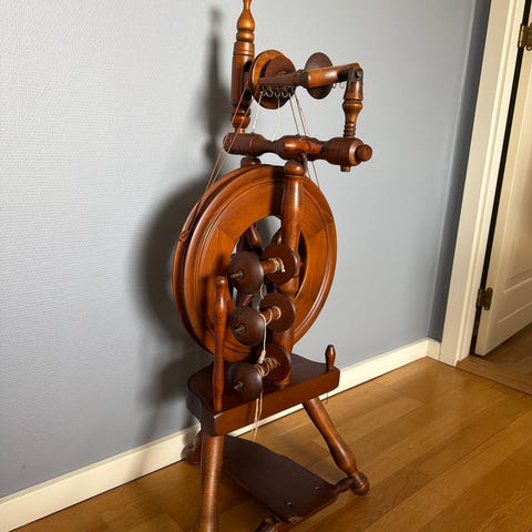 Spindeværk i træ til håndspinding af garn. Konstruktionen er lavet af træ og består af flere drejelige dele til spinding. Kan bruges til fremstilling af garn fra uld eller andre fibre. Velegnet til hobbybrug eller demonstration af traditionelle spindeteknikker.. inklusiv bog om håndværket.