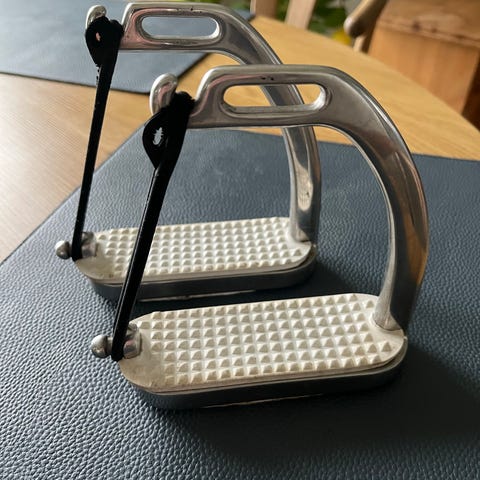 Stigbøjler med s-facon – sikkerhedsstigbøjler. Rustfri stål. God plads, til stigremmen.