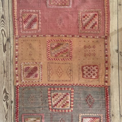 Fantastisk smukt. Tæppet stammer fra Marokko, vævet af berberstammer i Atlasbjergene.