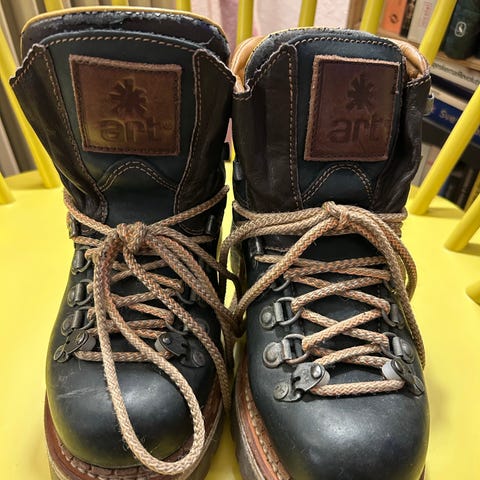 Rund snude. Trækstrop bagpå. Skridsikker sål. Snørre. Bjergbestigningsøskner.