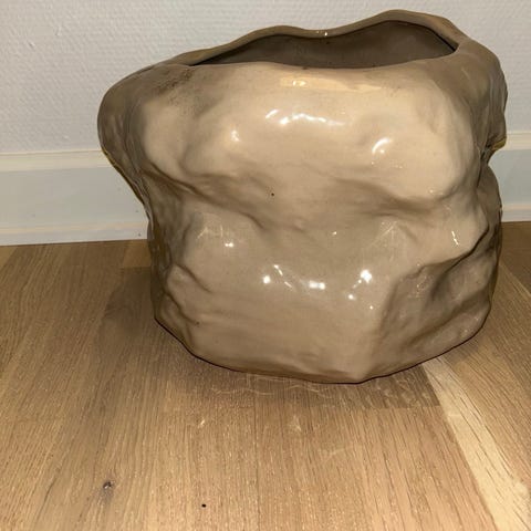 Ferm Living plant stand i flettet materiale. Den har en unik form med en bred øvre del og en smal fod, hvilket gør den velegnet til opbevaring af forskellige genstande som frugt, magasiner eller dekorationer.