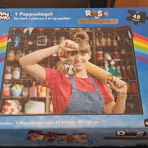 Rosa fra Rouladegade Ravensburger puslespil med 48 brikker. Puslespillet har en størrelse på 30 x 40 cm, når det er samlet.