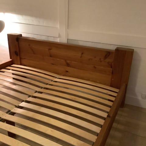 Vitra seng med lamelbund. Sengen er udført i træ og har en lys finish. Designet til at kunne foldes op for pladsbesparelse.