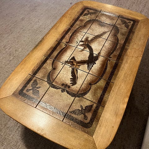 Sofabord i træ med indlagt dekorative porcelænskakler i blå, grønne og gule farver. Bordet har et rustikt udseende med synlige træårer. Kaklerne er placeret i et firkantet mønster på bordpladens ene side.
