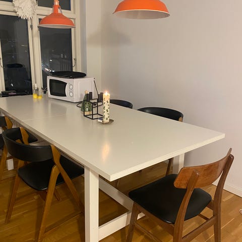 Hvidt IKEA-bord, kan skilles ad – plads til 6 personer