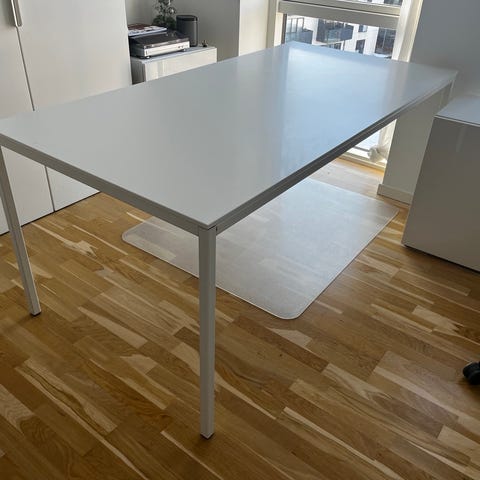 Jeg sælger et hvidt bord fra IKEA, som har været brugt i over 5 år, men som stadig er fuldt funktionelt og stabilt.