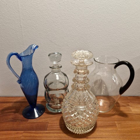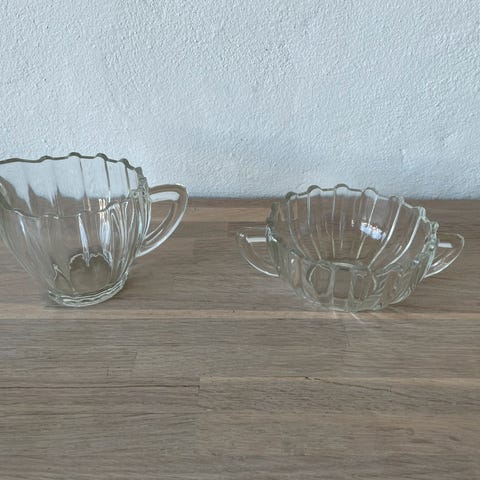 Glas, Kande og Skål - Blå glas, Sæt - kande/flødekande og Skål/sukkerskål. Kraftig blå glas (4 mm). Nobret mønster på ydersiden. Dekorativ. Hel og fin stand. Kande H - 9,7 cm. Skål H - 9,5 cm. Samlet vægt 480 gr. Samlet pris 50 kr. Se evt også mine mange andre annoncer med bla keramik og glas.