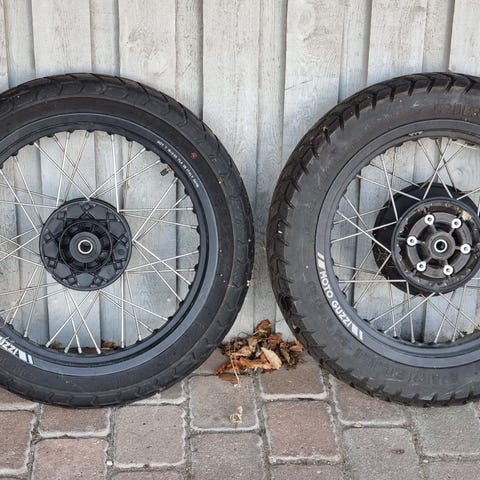 SCP motorcykelhjul med bredt dæk og skærm. Hjulet har eger og kromfinish. Skærmen er sort og lavet af et robust materiale. Velegnet til motorcykler med behov for bredt baghjul og skærm.