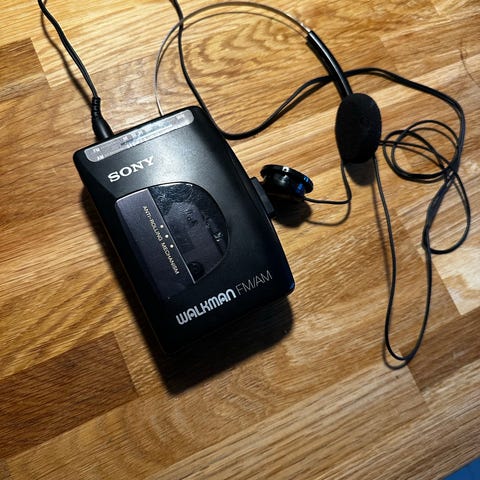 JVC CX-F7K Walkman kassetteafspiller med FM/AM radio. Bærbar enhed designet til afspilning af kassettebånd. Enheden har en sort og sølvfarvet finish og inkluderer en beskyttende etui.