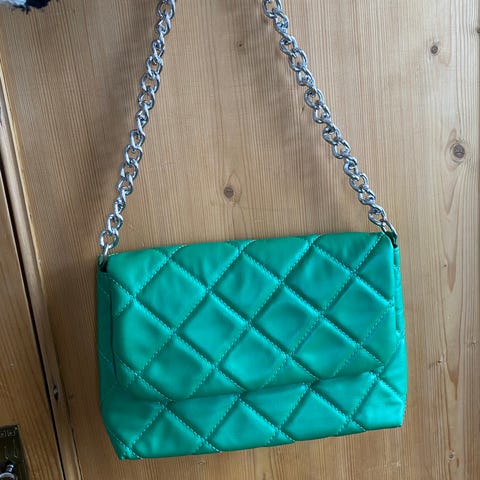 Har en lynlås samt en aftagelig skulderstrop i guldfarvet metal.